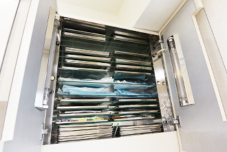 紫外線灯の光により滅菌状態を保てる棚です。洗浄・滅菌した器具を診療直前まで滅菌しながら保管が可能です。